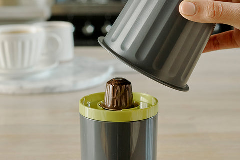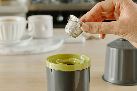 Dualit's EcoPress™ offers a mess free solution to recycling used aluminium coffee capsules. The EcoPress removes the coffee grounds from the capsules allowing for quick and easy recycling.